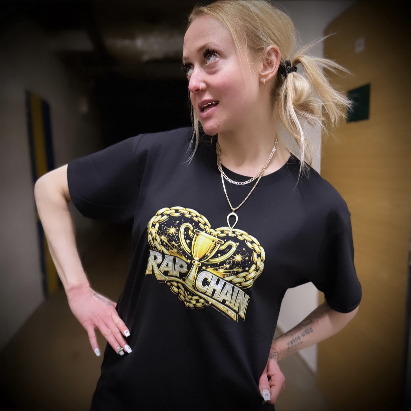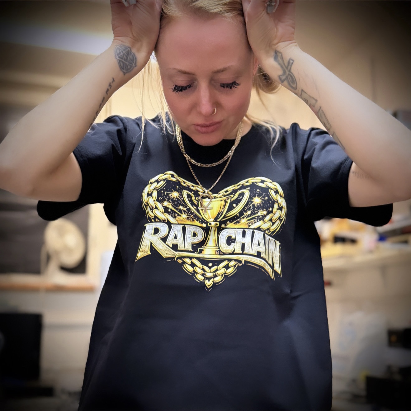 Limitovaná edice promo tees. Zepředu potisk, zezadu našitý zlatý řetizek.